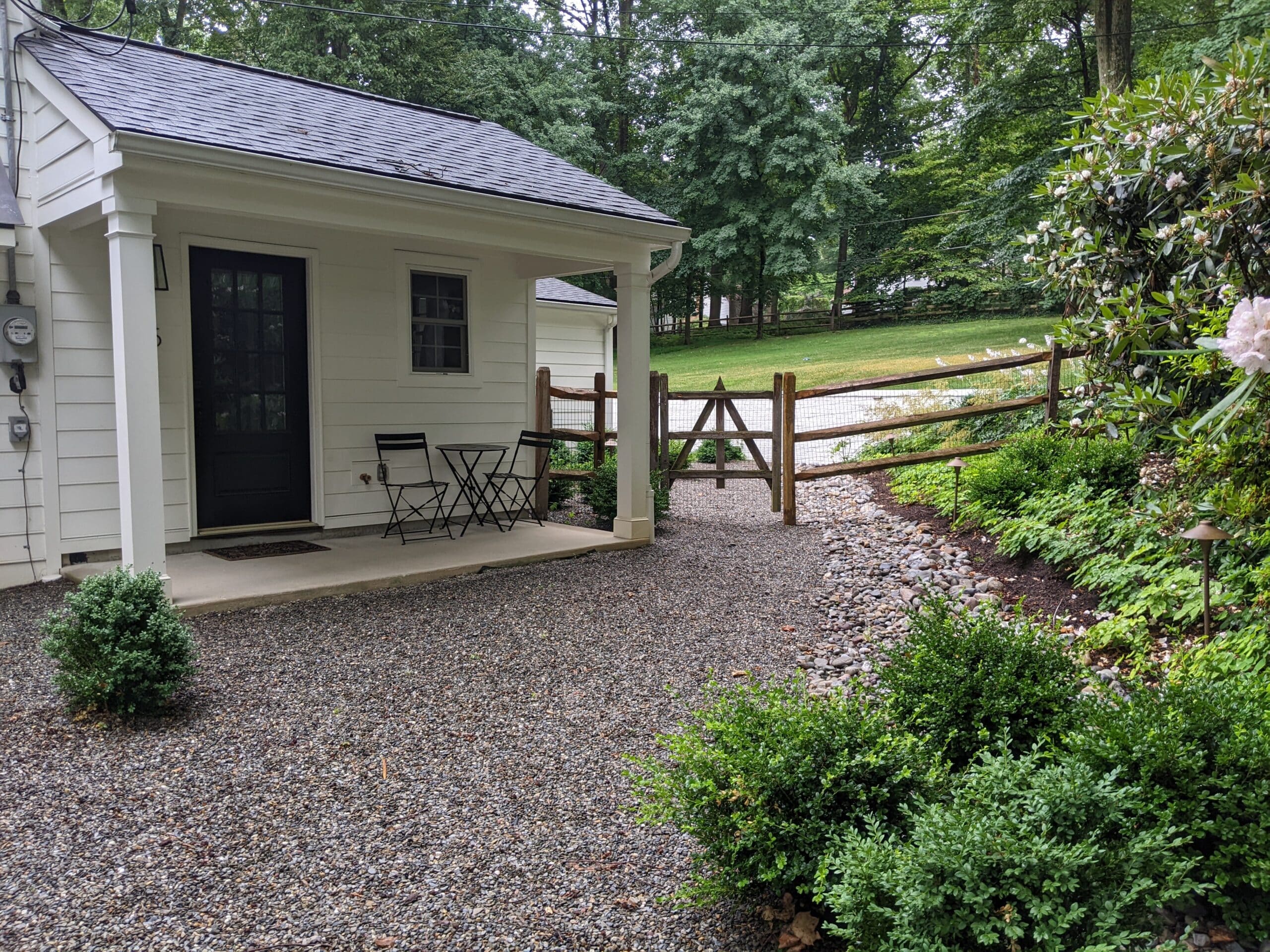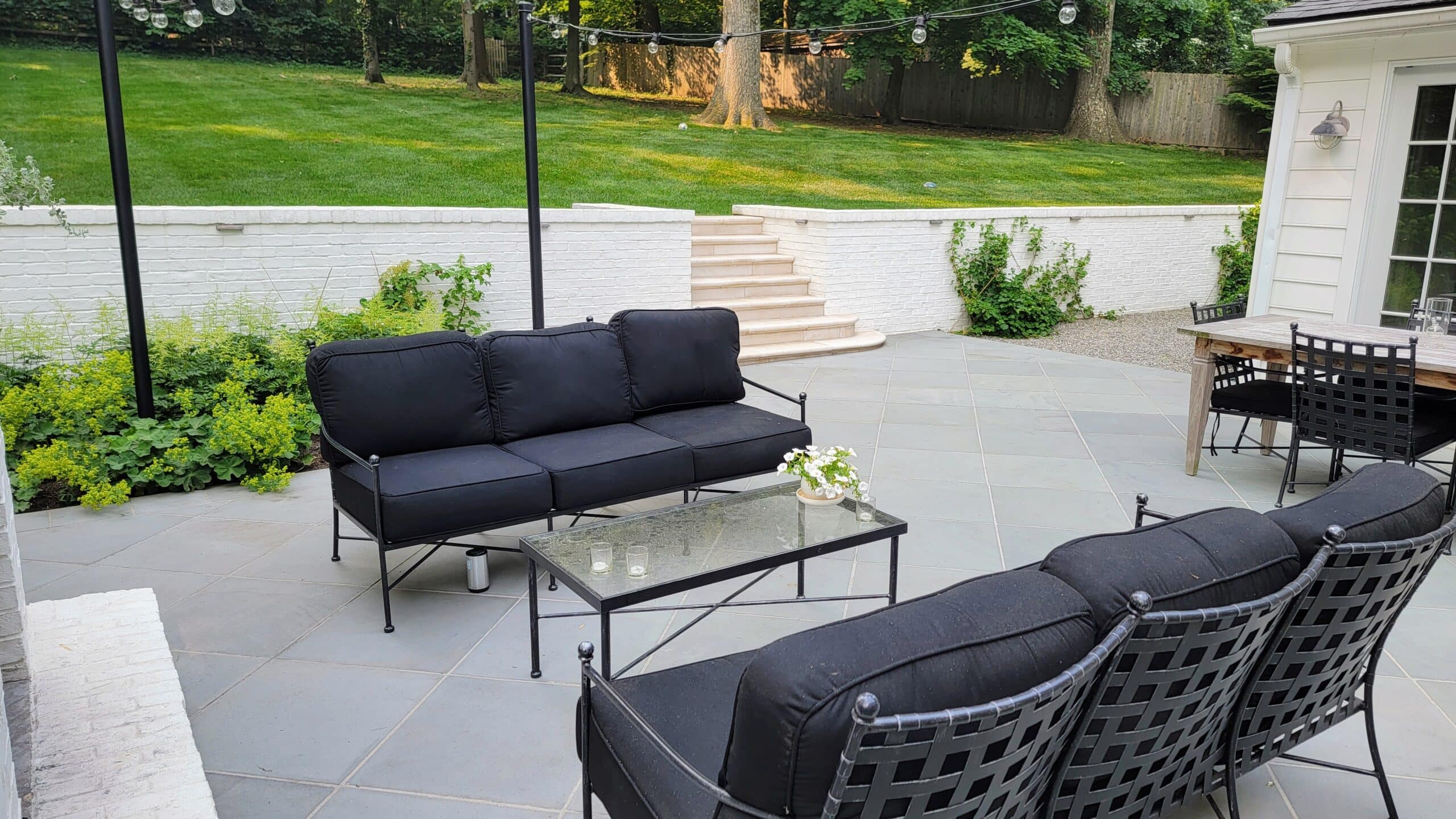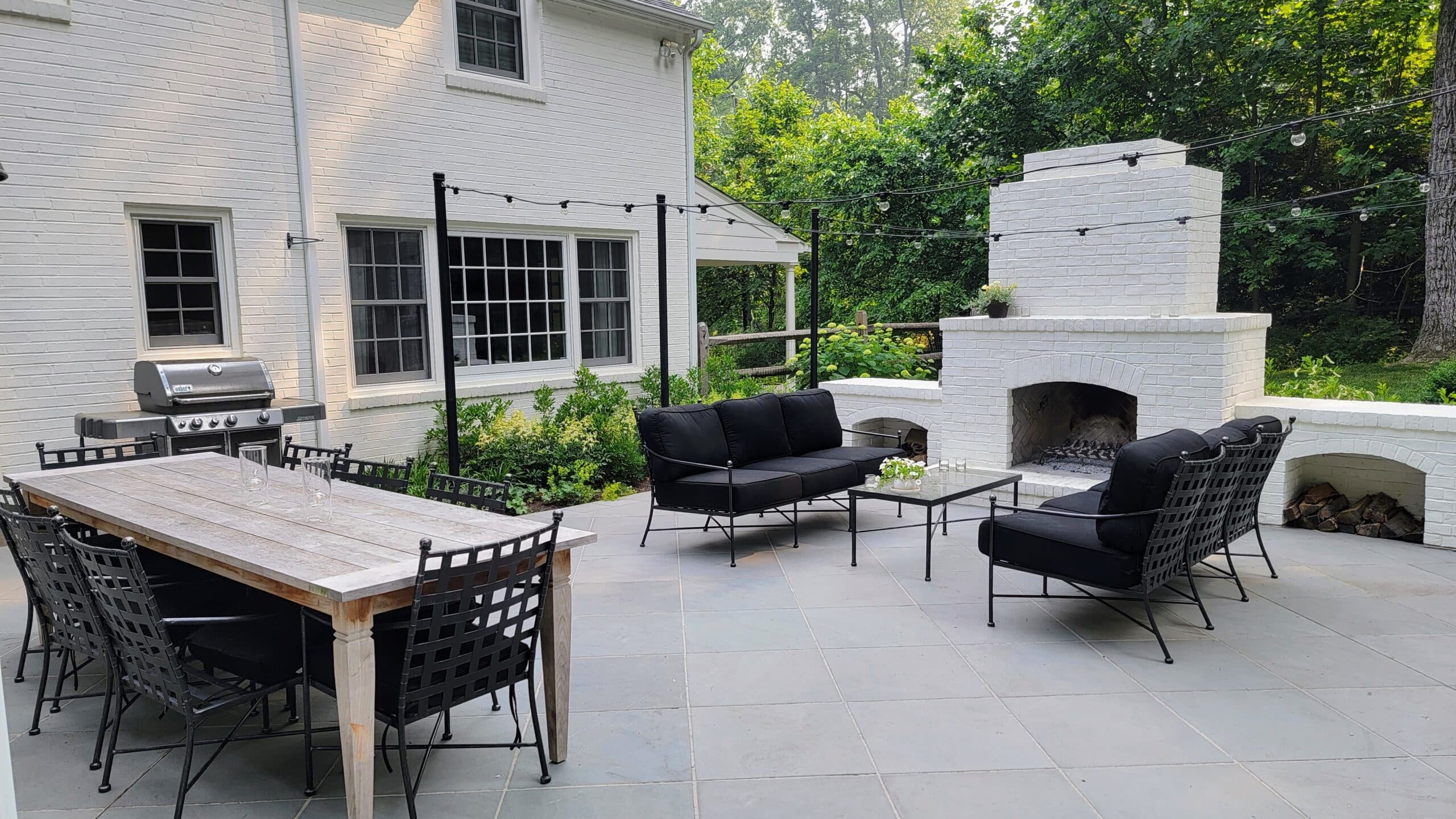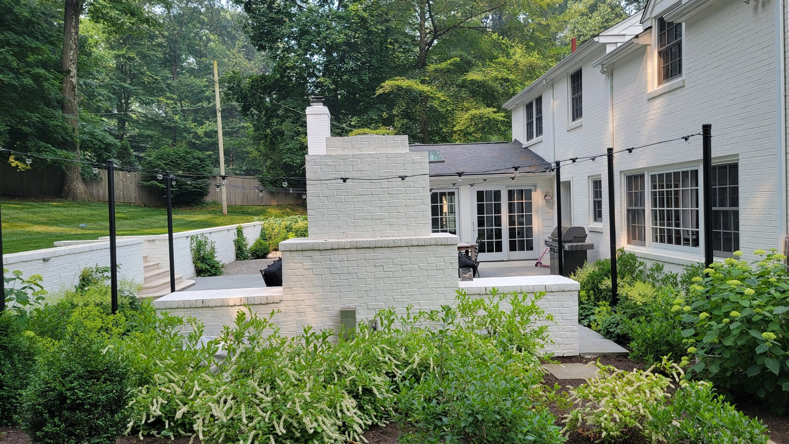 Completed in summer of 2021, the Berwyn Patio is a complete transformation of a backyard space that was cramped and dated to a stylish and comfortable extension of the house. A wood burning fireplace is the centerpiece of the space, surrounded by white, chartreuse and dark green and decorated with sparkling lights. The retaining wall is thin brick that was painted white to match the house and custom cut stone stairs leading to the lawn beyond. Pennsylvania bluestone paves the center of the space while water-permeable river-washed gravel creates casual access.